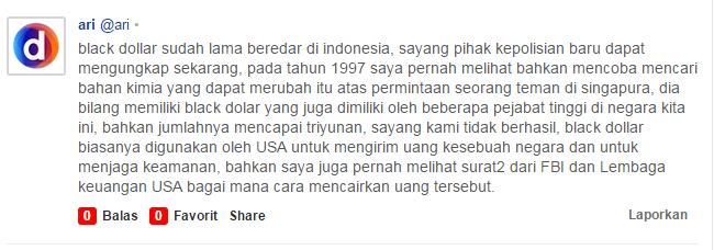 Dari beberapa berita dan forum , sebenarnya black dollar sudah marak di indonesia sejak tahun 1997 berikut komentar narasumber yang mungkin tidak bisa di vonis kebenaran nya :![]() |